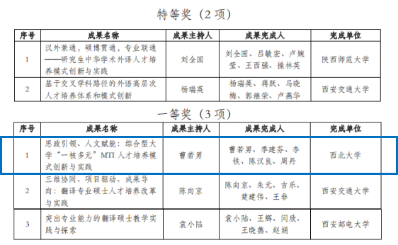 日前,陕西省学位与研究生教育学会公布了2023年陕西省外语教学成果奖评选结果,我校申报的2项教学成果全部获奖,其中我院申报的“思政引领、人文赋能:综合型大学‘一核多元’MTI人才培养模式创新与实践 ”成果获得一等奖